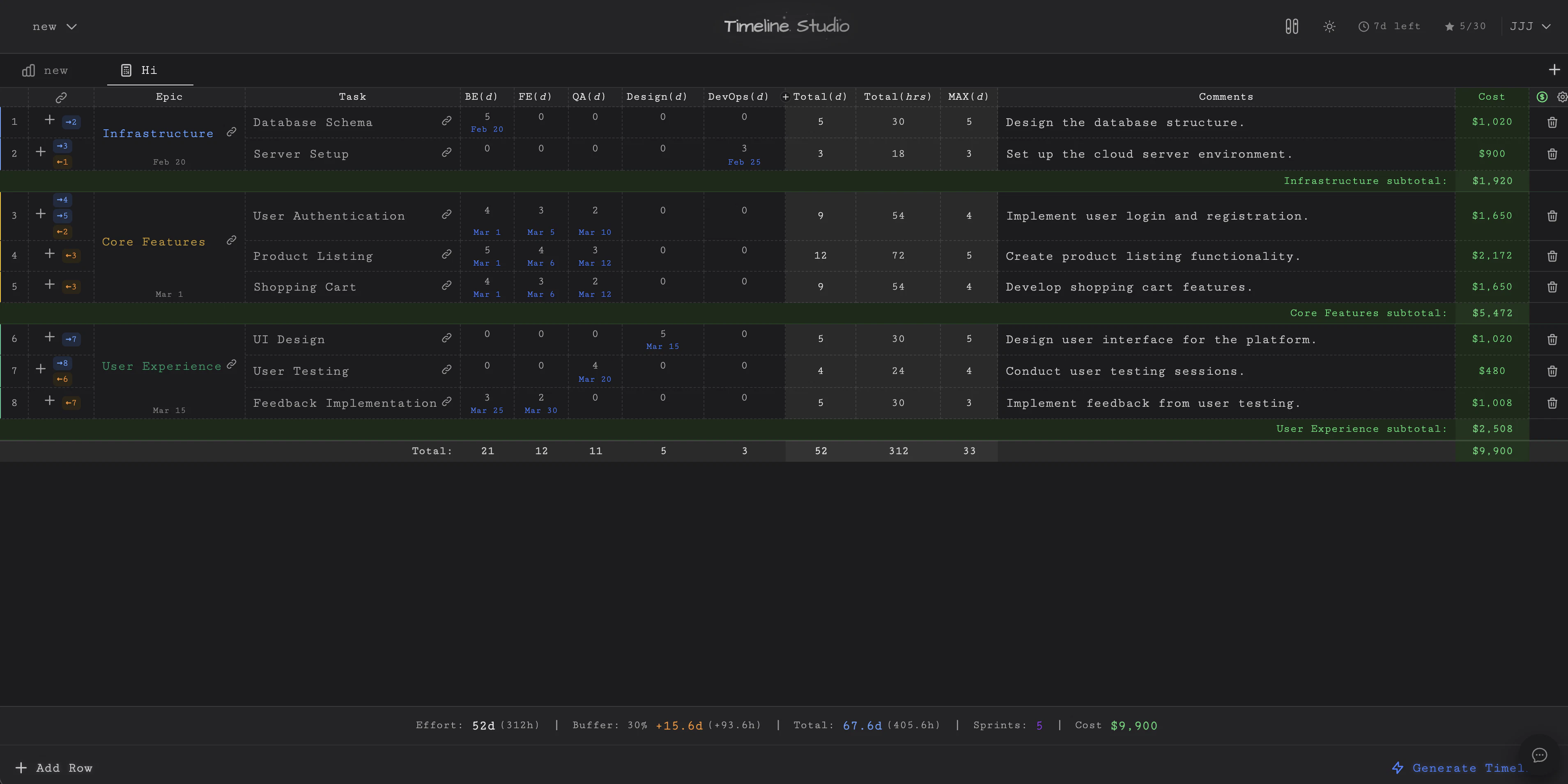 Timeline Studioは、説明をAIが解釈して数秒でタスク・作業量の見積り・依存関係・ガントチャートを生成します。クイックドラフト、クライアント提案、初期スコープ設定に適し、費用見積もり...