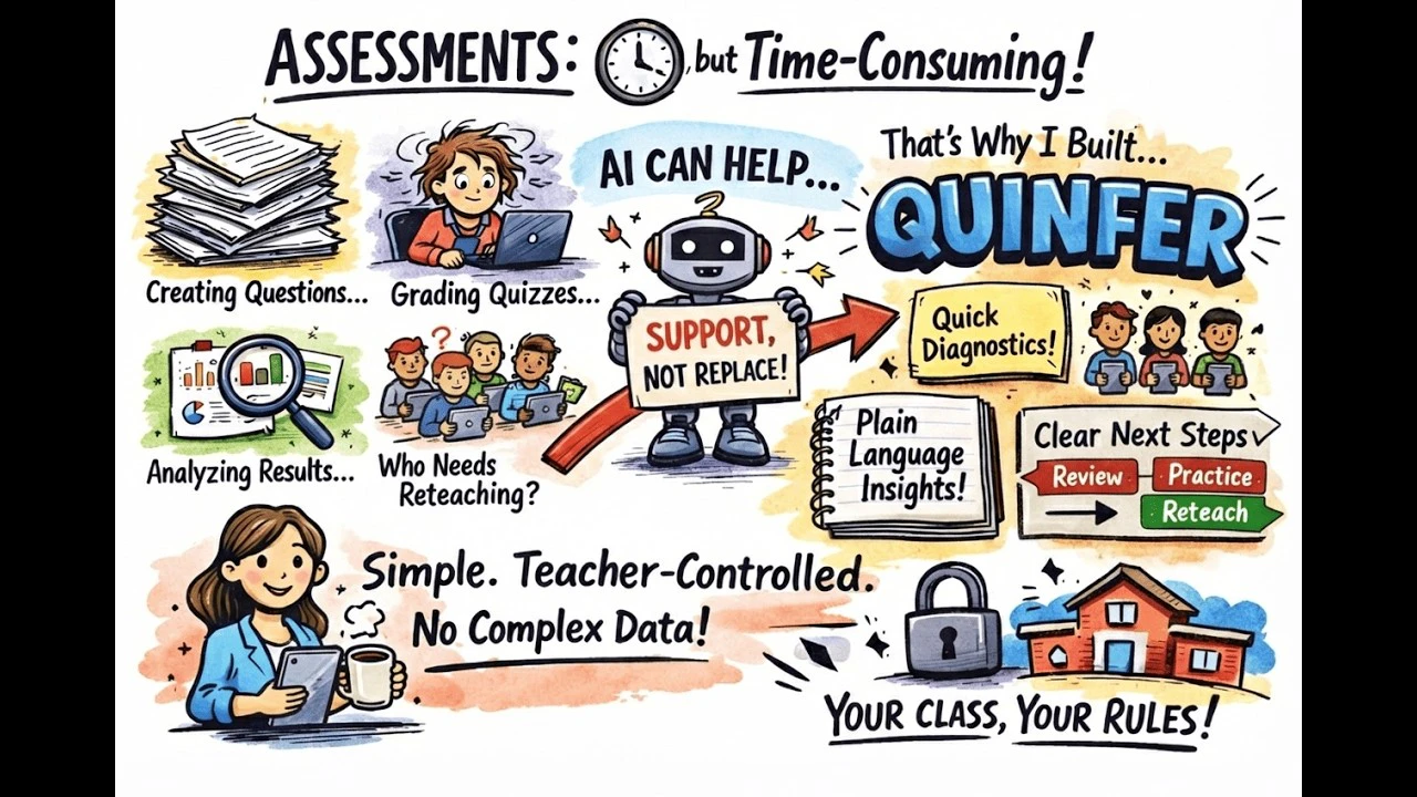 ## 概要 Quinferは1対1の教室向けに設計されたデスクトップ型評価ツール。短時間で診断クイズを作成し、生徒の回答を平易な言葉で読み解くことで、学習ギャップ・誤解・次のアクション(再指導・...