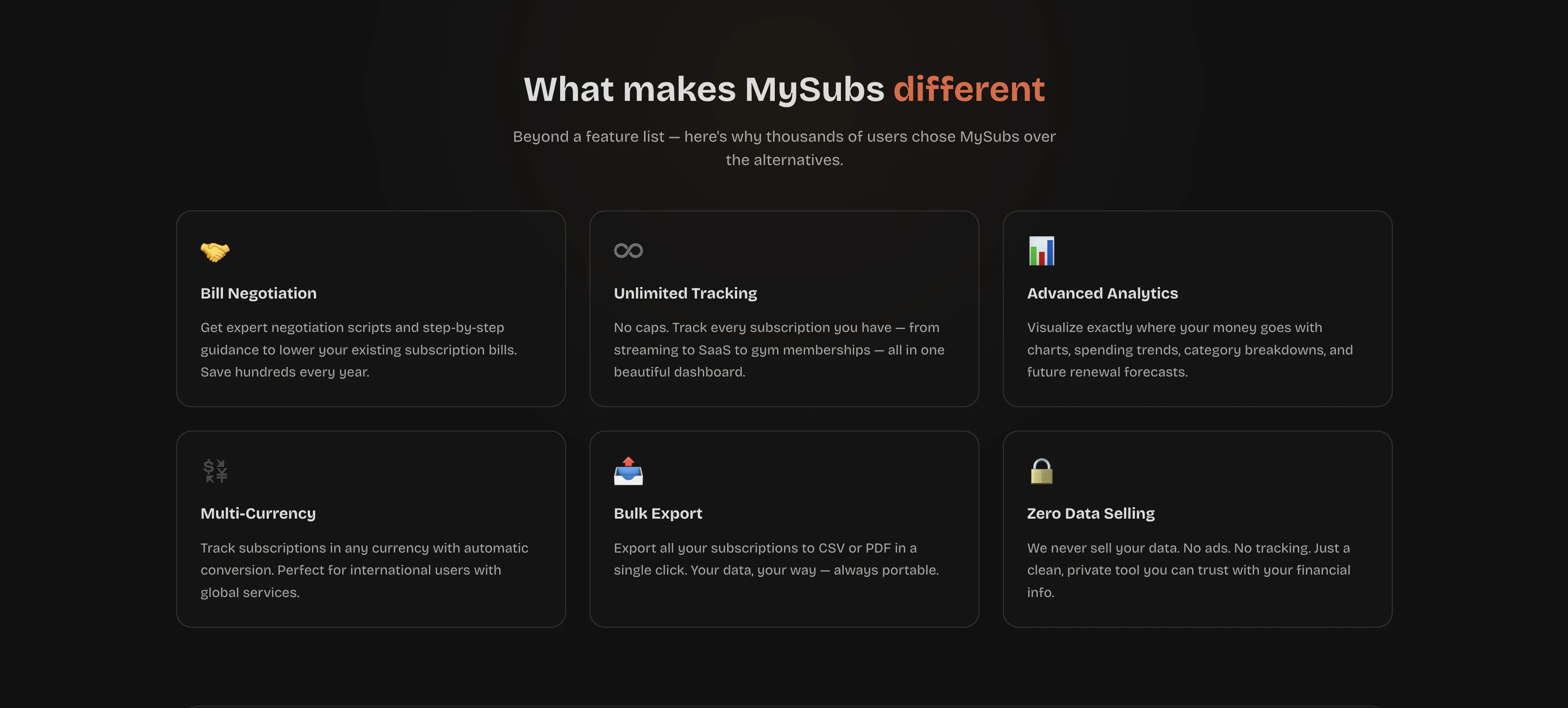 ## 概要 MySubsは、すべてのサブスクリプションを一つの場所で管理できるシンプルなツールです。定期支払いを一括追跡し、更新日を事前に知らせ、実際の月額・年額コストを明確化します。小さな出費...