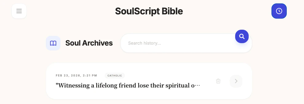 ## 概要 SoulScript Bible は、声やテキストから感情を読み取り、好みの翻訳で聖句を3つ選出、状況に合わせた300語超の“恵みの説話”を生成するAIパートナーです。7言語・カトリ...