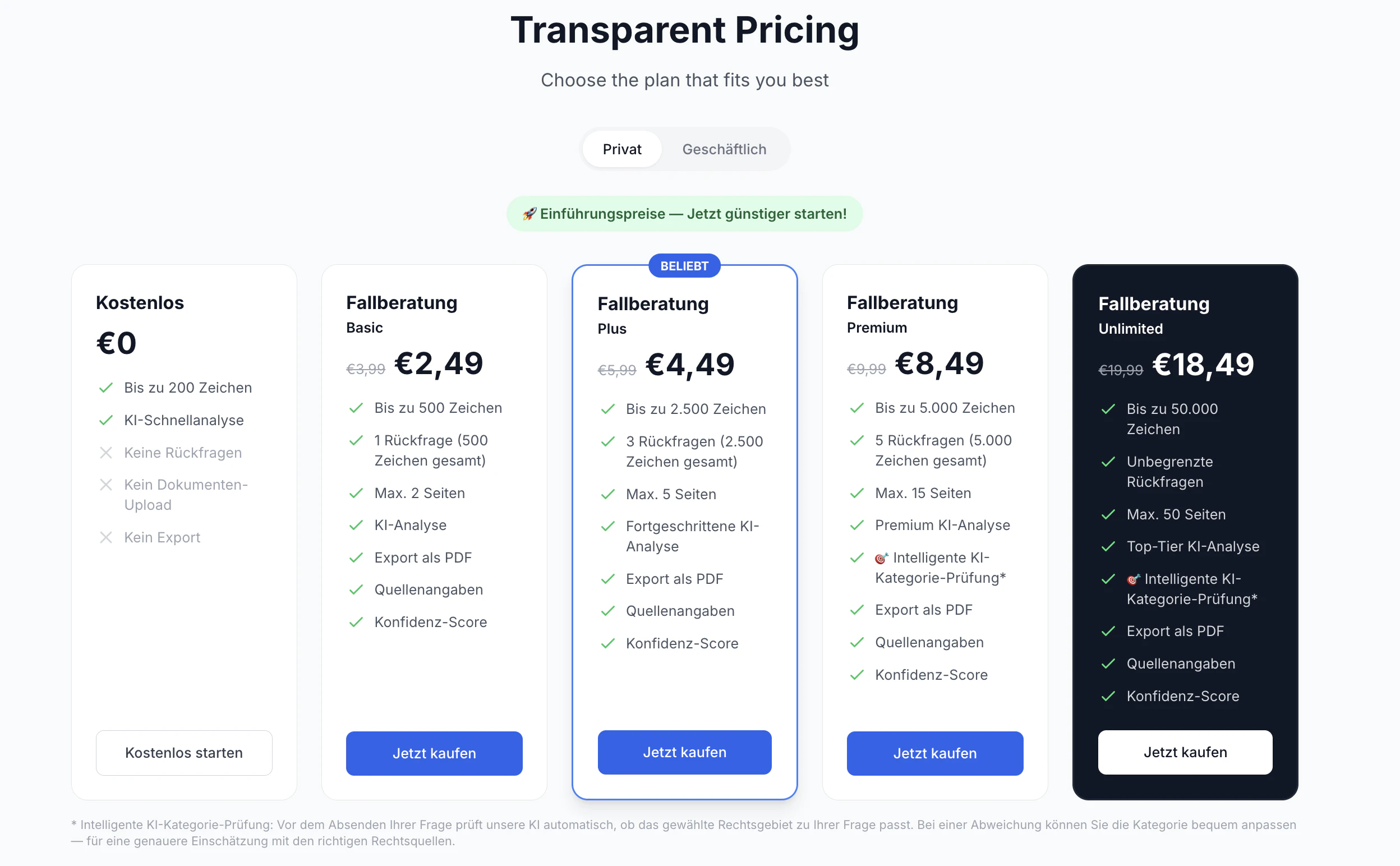 ドイツ法に関するAI支援の初回評価ツール。問題を説明し文書をアップロードすると、引用条文と判例を含む構造化分析を数分で取得。雇用・賃貸・交通・私法・社会法の5分野を、実データベースに基づいてカバ...
