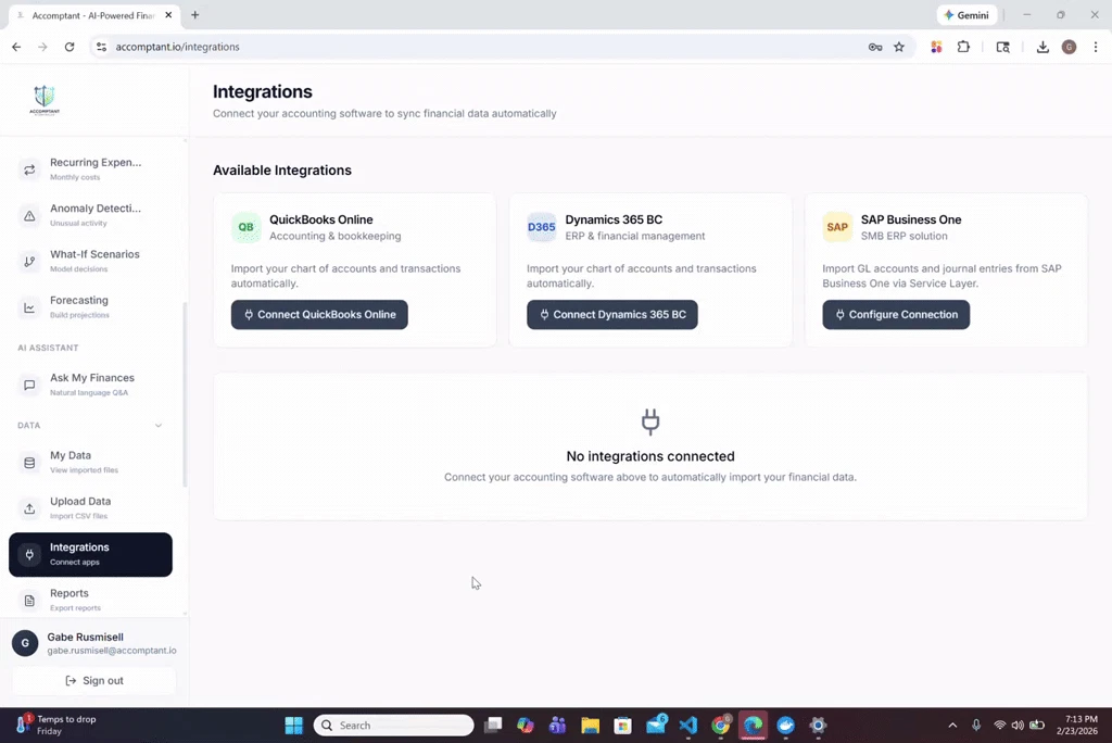 Accomptantは、CSVアップロードまたはERP連携を通じて、AI生成のP/L、赤黄緑の信号アイコン付きKPIダッシュボード、異常検知、キャッシュフローカレンダー、予算対実績分析、What...