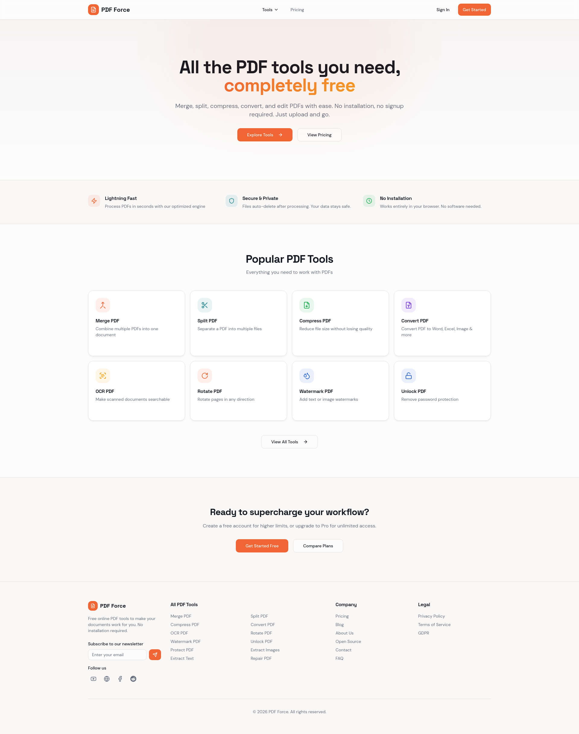 PDFForceは、ブラウザ上で動作する高速で予測可能なPDFツールです。インストール不要で、アップロードして問題を解決するだけ。結合・分割・圧縮・変換・編集をすぐに実行でき、ファイルが大きすぎ...