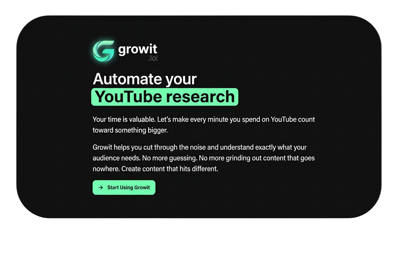 GrowItはデータ駆動のYouTubeクリエイター支援ツール。勝ちパターンを特定し、失敗を修正して再現性の高い動画フォーマットを構築します。実データの外れ値分析により、繰り返し可能なフォーマッ...