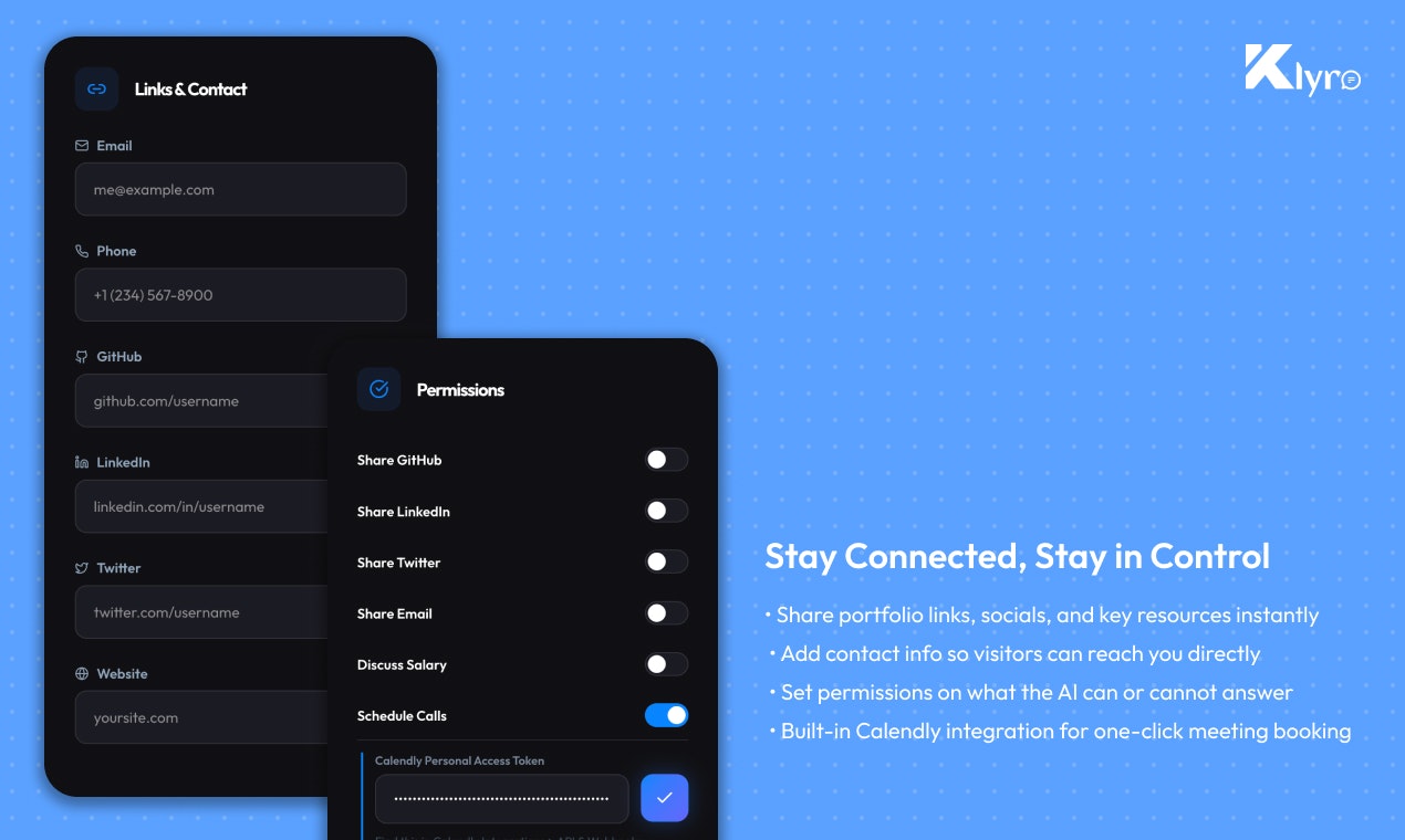 ## 概要 Klyroは任意のサイトに無料のカスタムAIチャットボットを数分で追加できるソリューションです。サイトのコンテンツから学習し、訪問者の質問に24時間365日、あなたのペルソナで回答し...