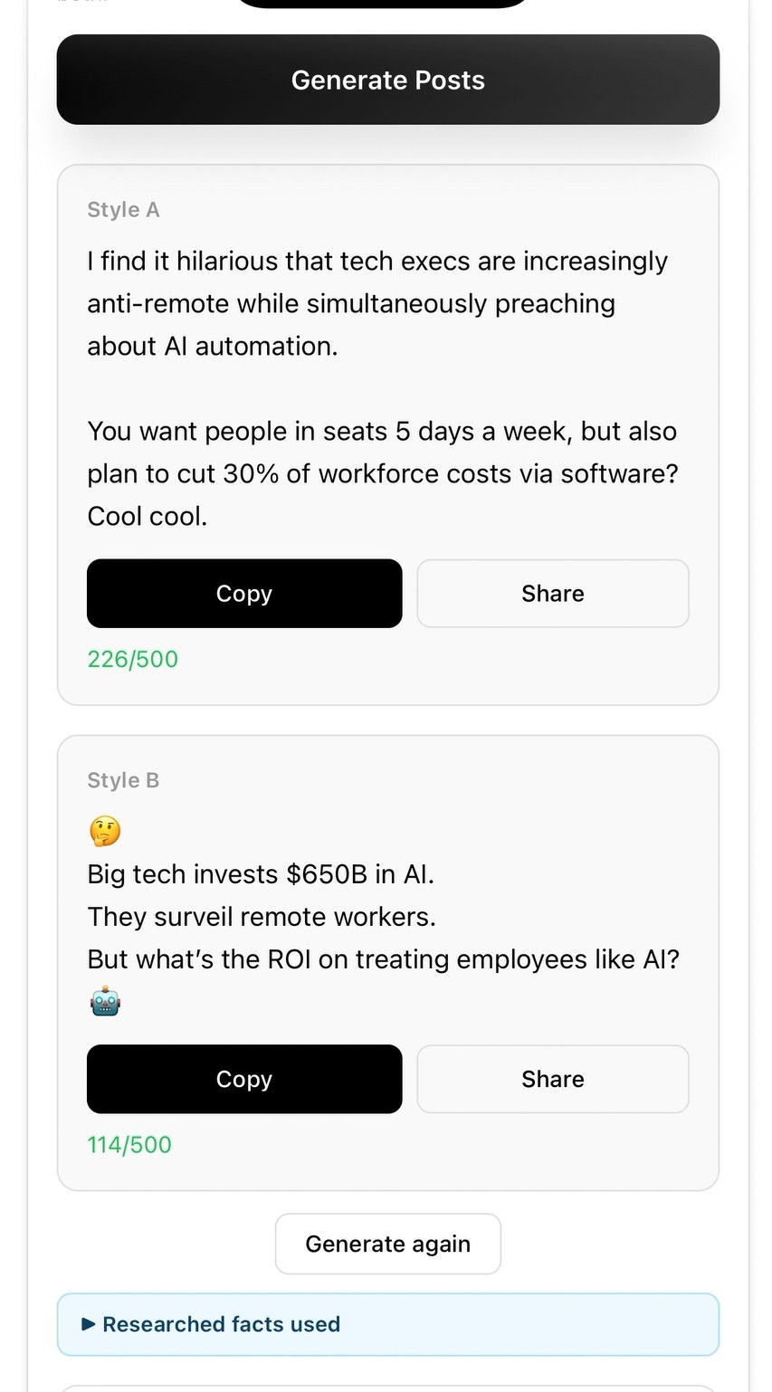 任意の Threads プロフィールを貼り付けるだけ。彼らのスタイルでバイラル投稿を作成します。