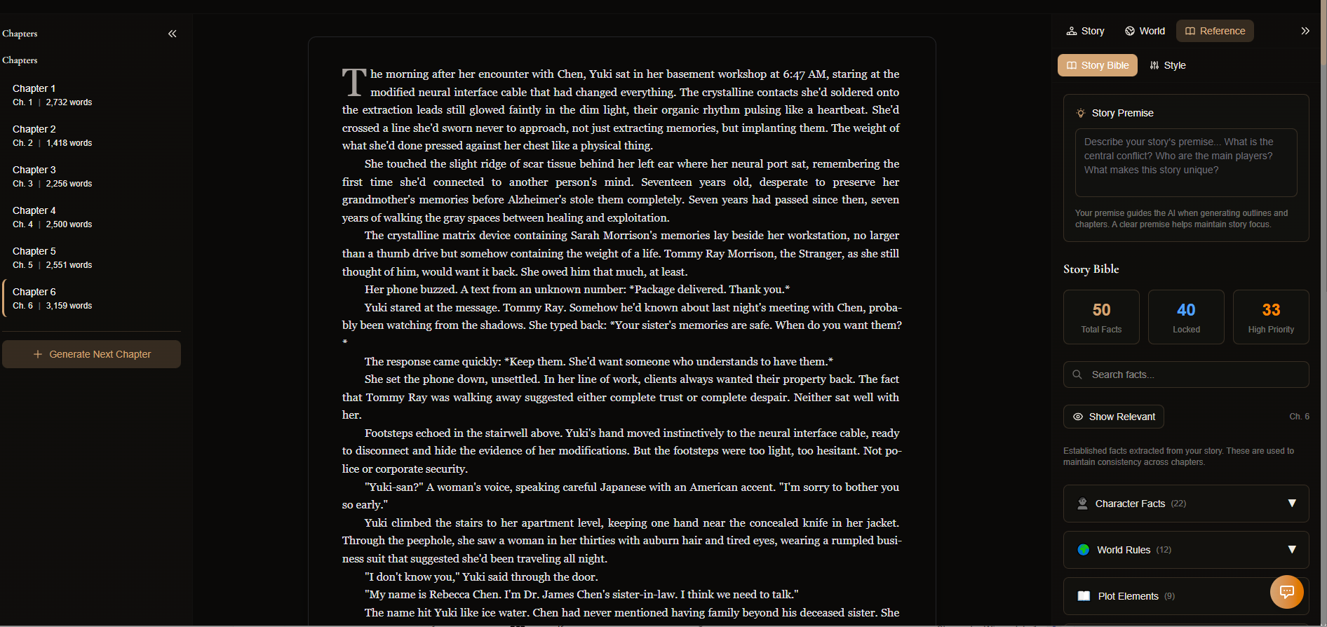 ## 概要 - 物語をちゃんと覚えるAI執筆プラットフォーム。登場人物・プロット・世界設定を全体で追跡・管理し、一貫性を保つ。 - 章ごとに矛盾を自動検出。既存の下書きを取り込んでAIが改善して...