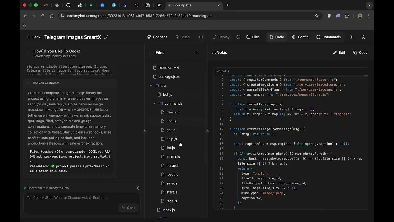## 概要 CookMyBotsは、シンプルなチャットを“動作するボット”へエンドツーエンドで迅速に変換します。プロンプト → 動くボット → 自動リポジトリプッシュ → ワンクリックデプロイの...