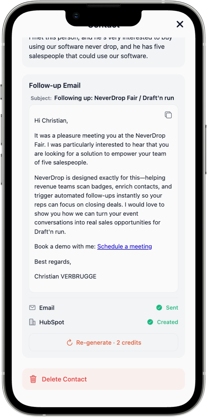 Scan a business card, add voice context, get an AI-drafted follow-up — all before you leave the b...