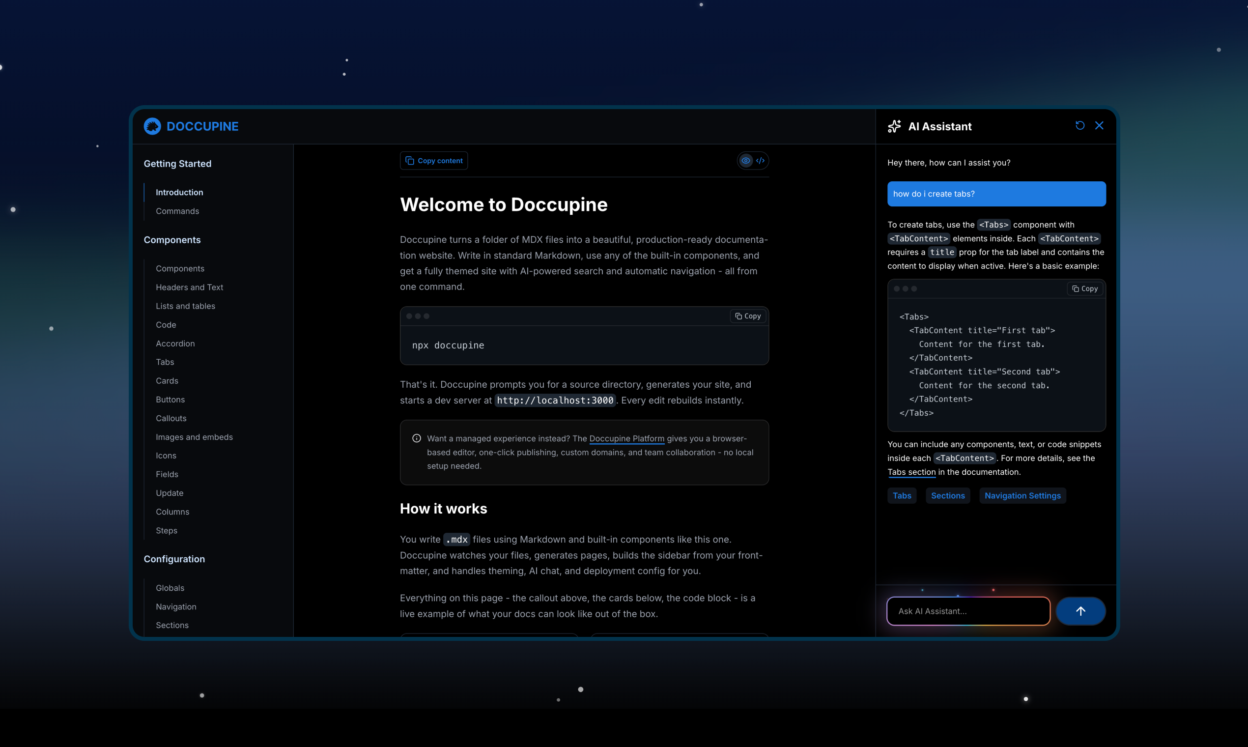 Open source CLI turns your Markdown or MDX files into beautiful documentation. Bring your own AI ...