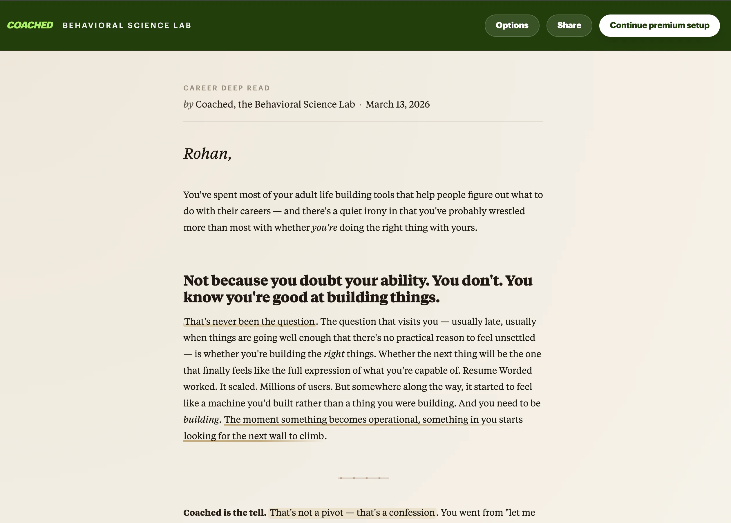 Paste your LinkedIn URL and get a deep, personal read on your career — your patterns, your blind ...