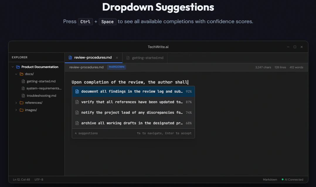 TechWrite is a technical writing platform with AI autocomplete that draws suggestions from your o...