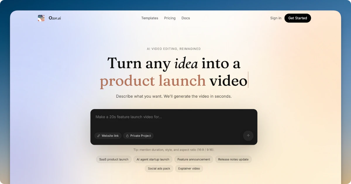 Turn any idea into a professional launch video in seconds with Ozor. Perfect for startups, market...