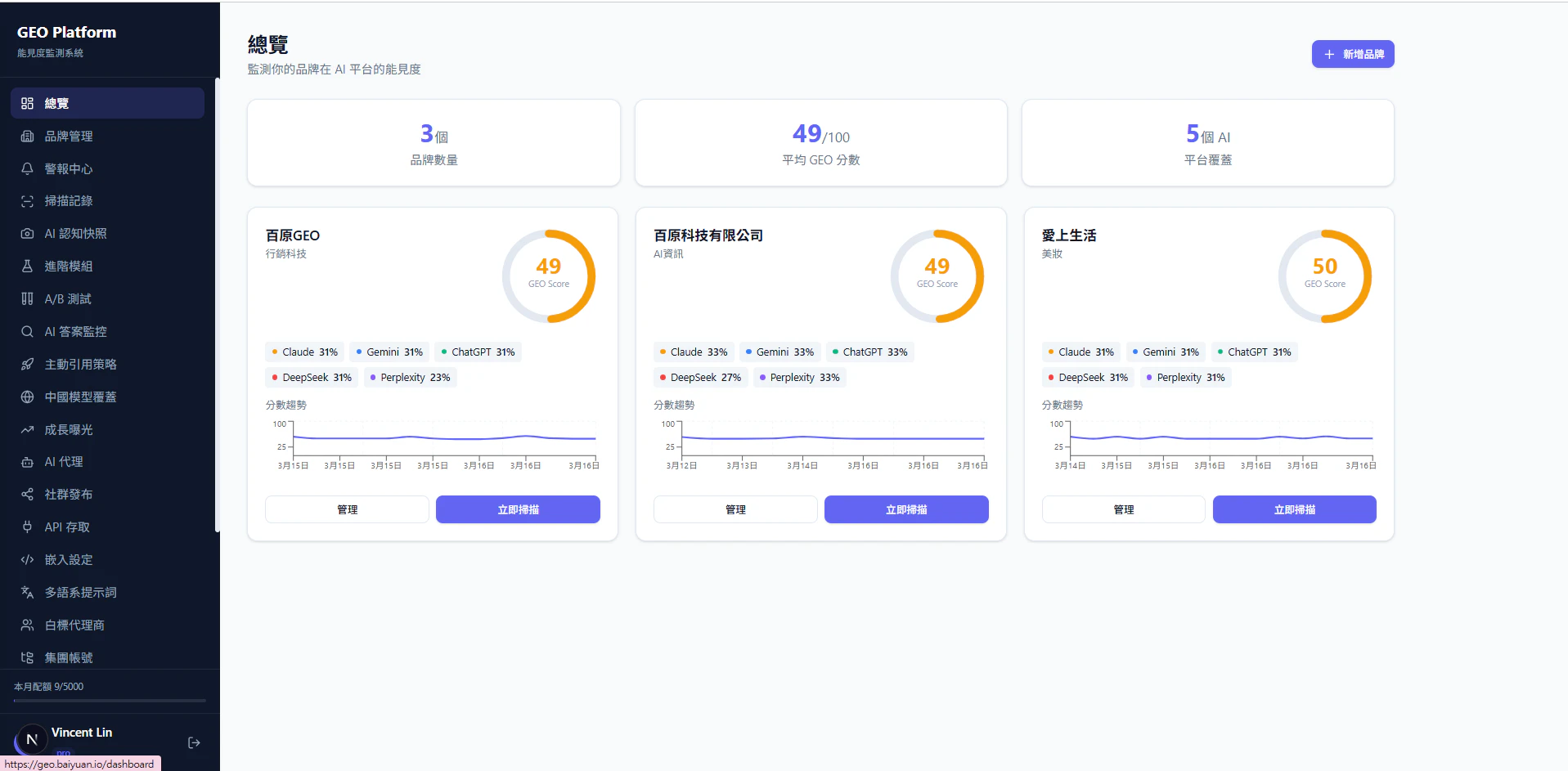 GEO Platform monitors your brand's AI citation rate across 19 LLMs — ChatGPT, Claude, Gemini, Per...