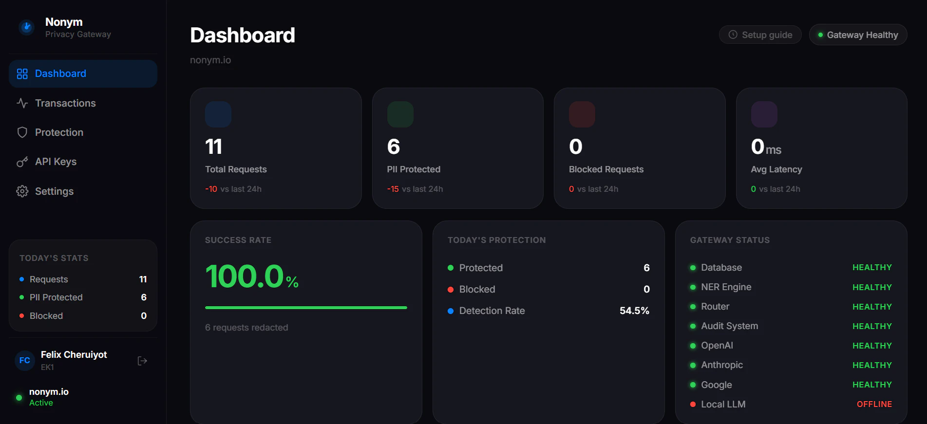 Nonym is a high-performance Privacy Gateway for AI - intercepts, anonymizes, and protects sensiti...