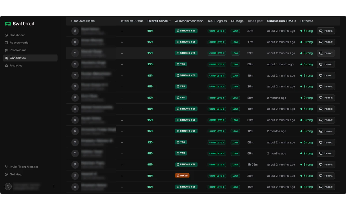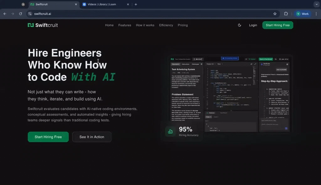 SwiftCruit evaluates candidates with AI-assisted coding environments and AI-driven, role-specific...