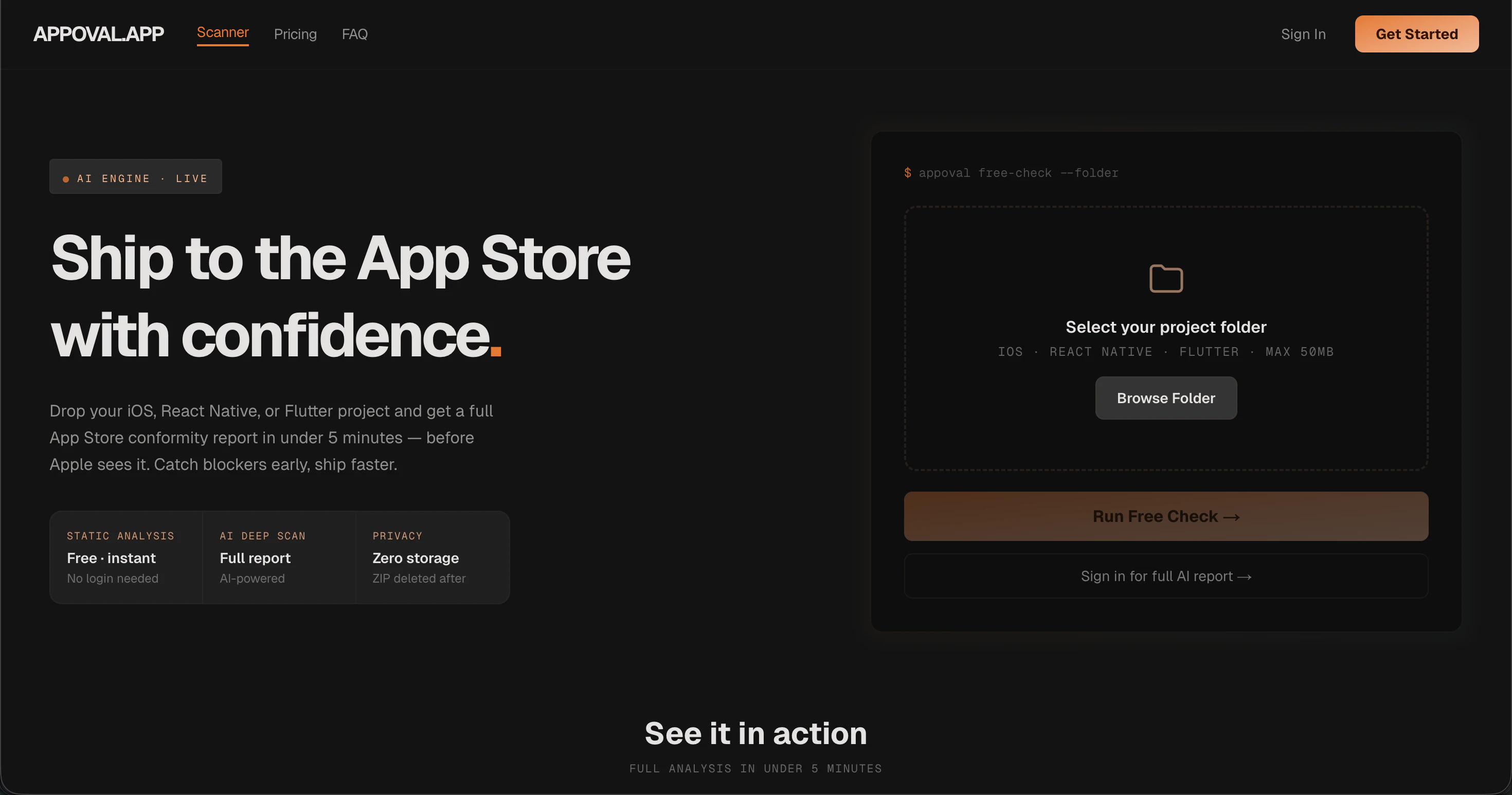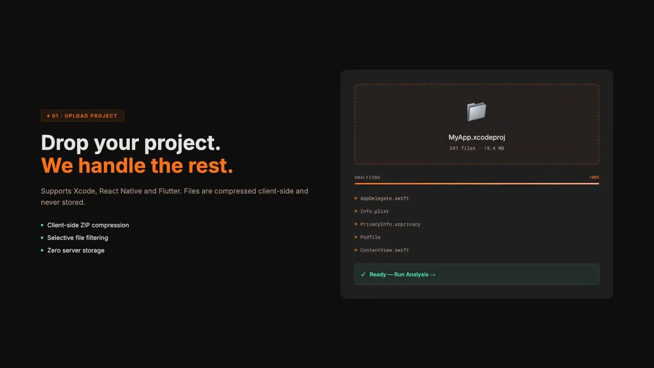 Appoval scans your iOS, React Native, or Flutter project against all App Store guidelines and fla...