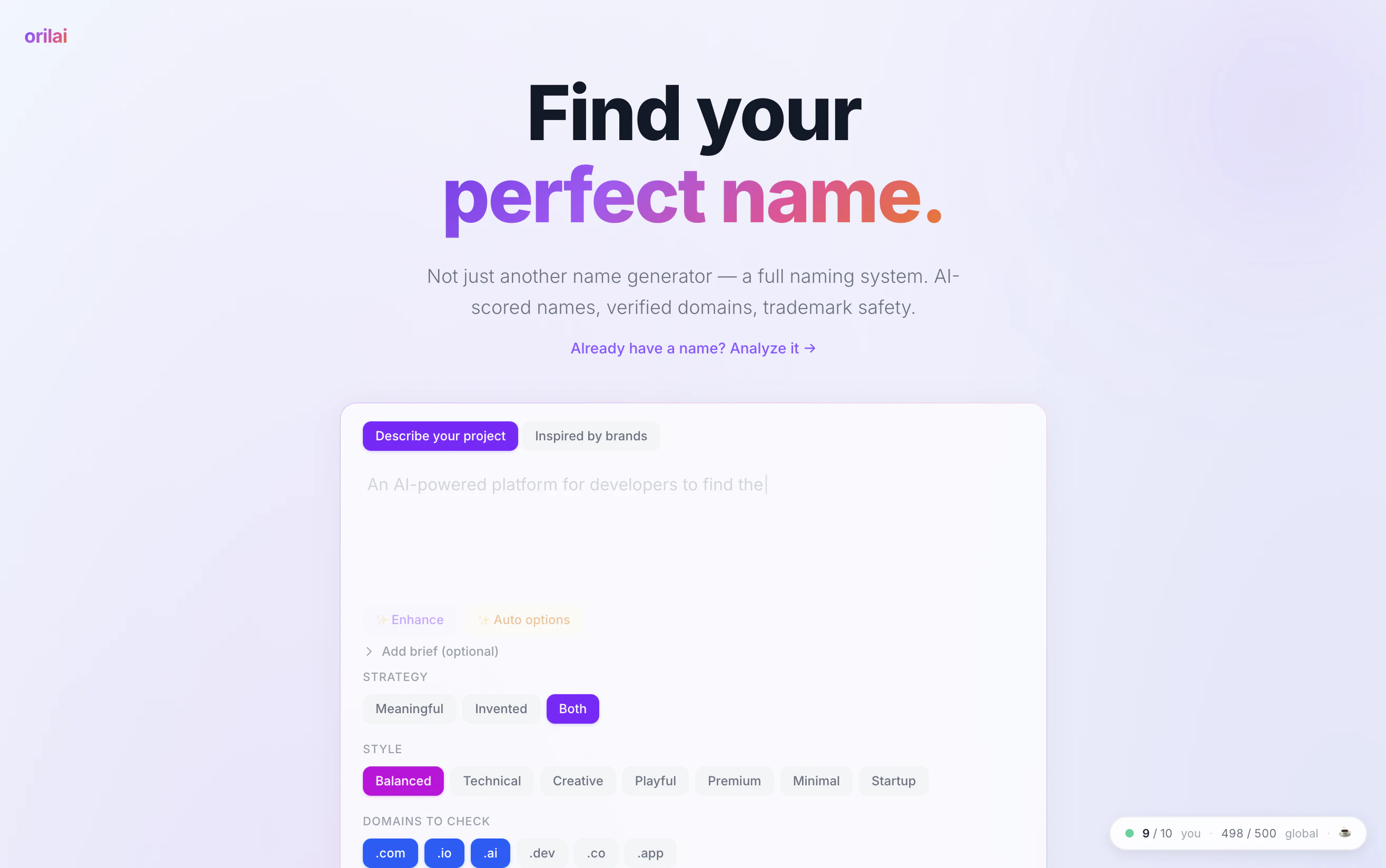 Not just another name generator. Orilai validates every name across domains, trademarks, phonetic...