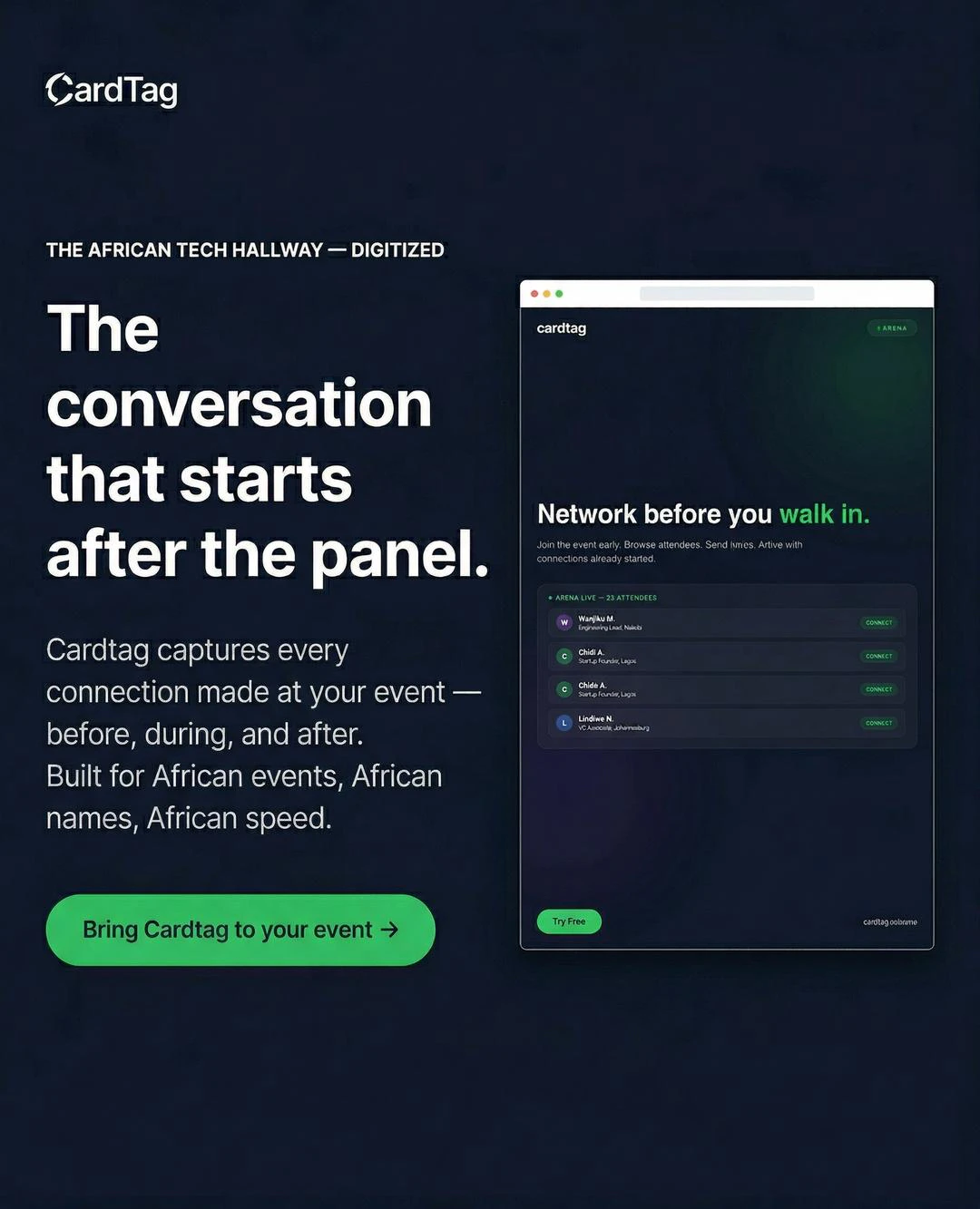 The networking platform for Africa's tech ecosystem. Live event networking, AI follow-ups, and co...