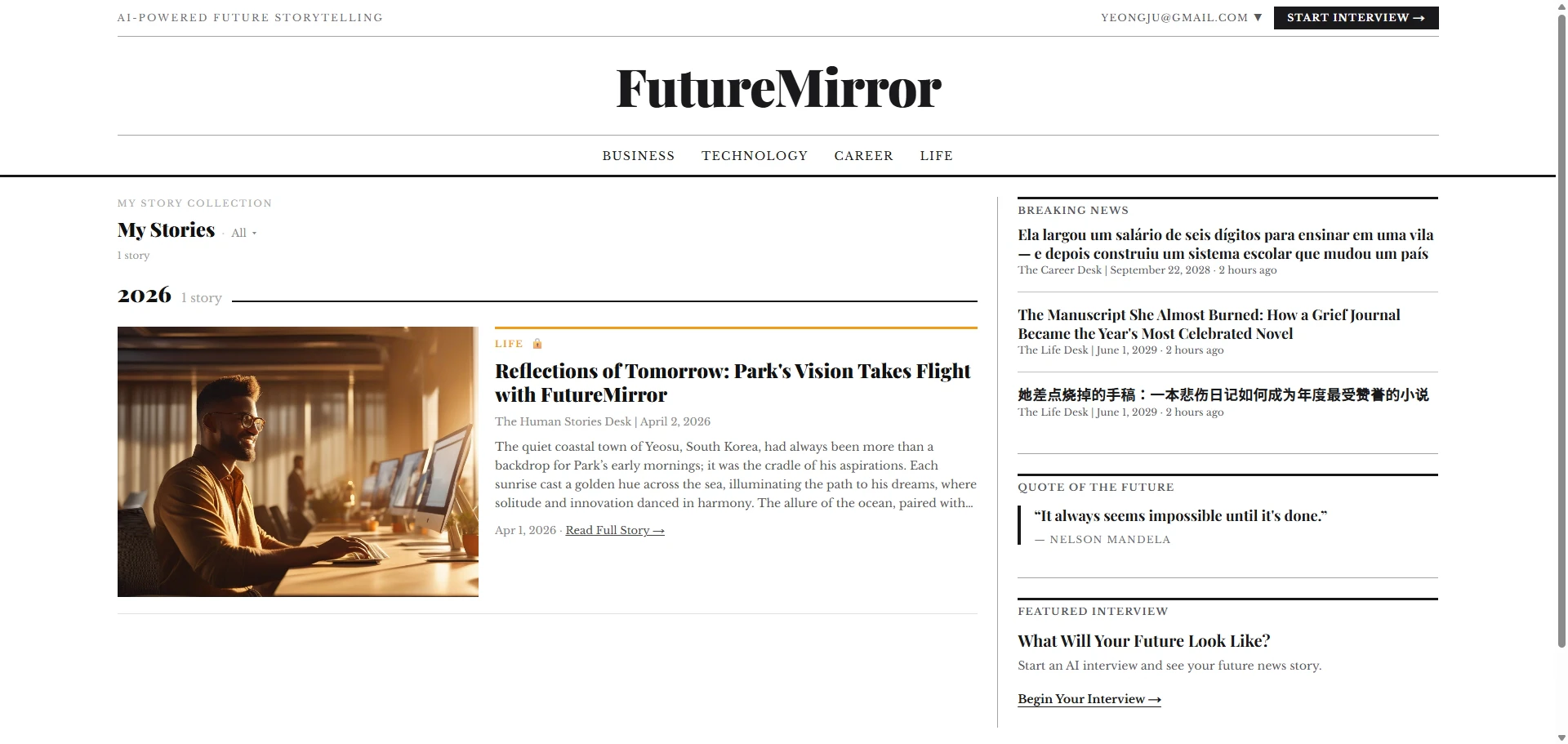 FutureMirror turns your future ambitions into a personalized, front-page motivational story. Our ...