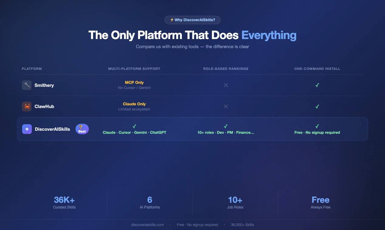 Most AI skill directories are scattered, outdated, or locked to one tool. DiscoverAISkills is the...