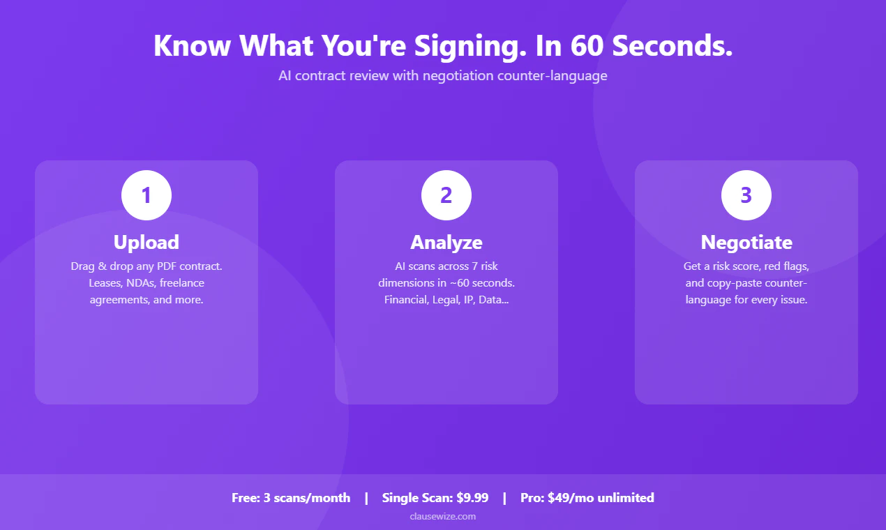 Upload any PDF contract — lease, NDA, freelance agreement, employment contract — and get a full r...