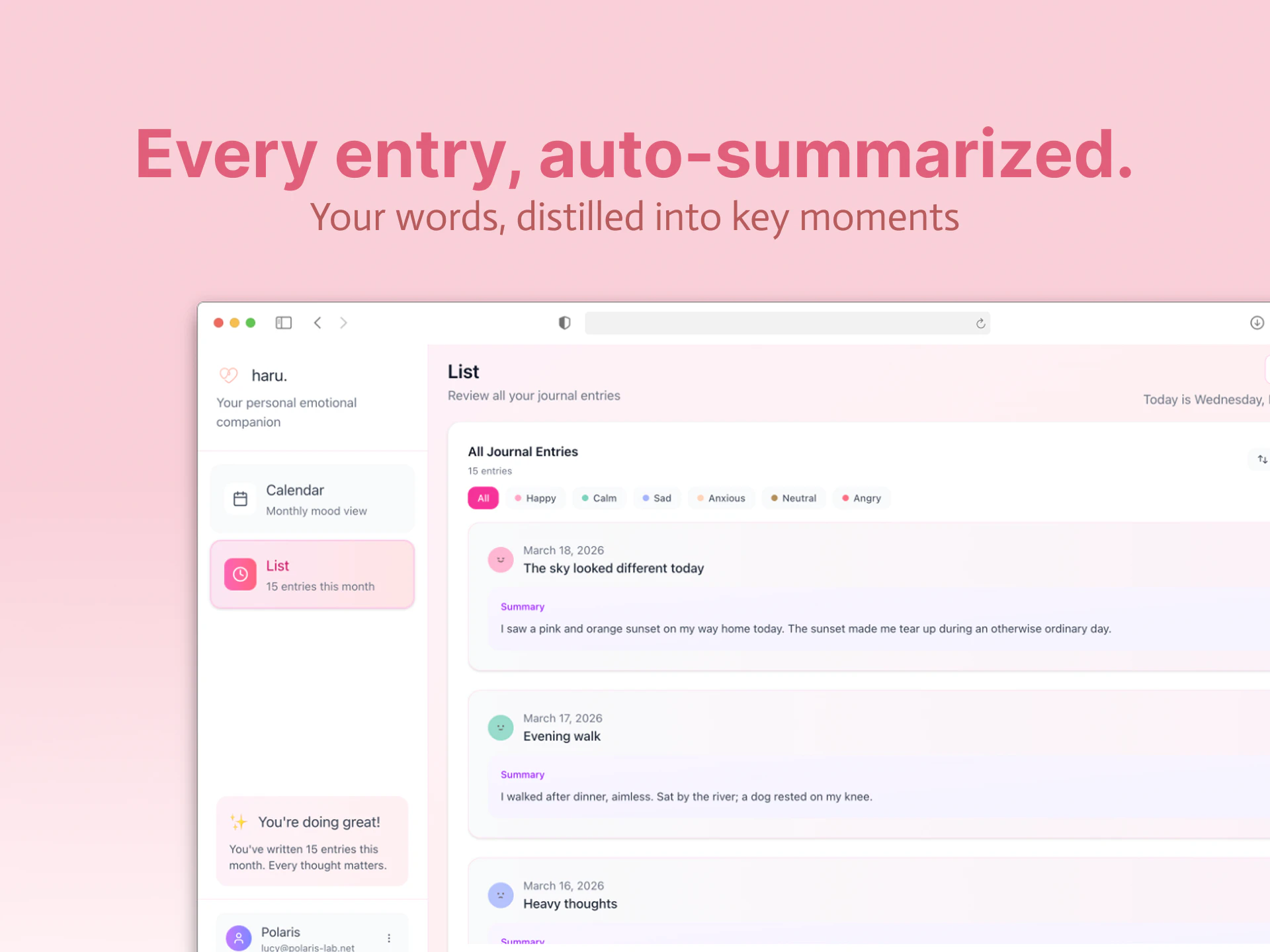 haru is a diary that doesn't just store your words — it reads them. Write an entry, and haru resp...