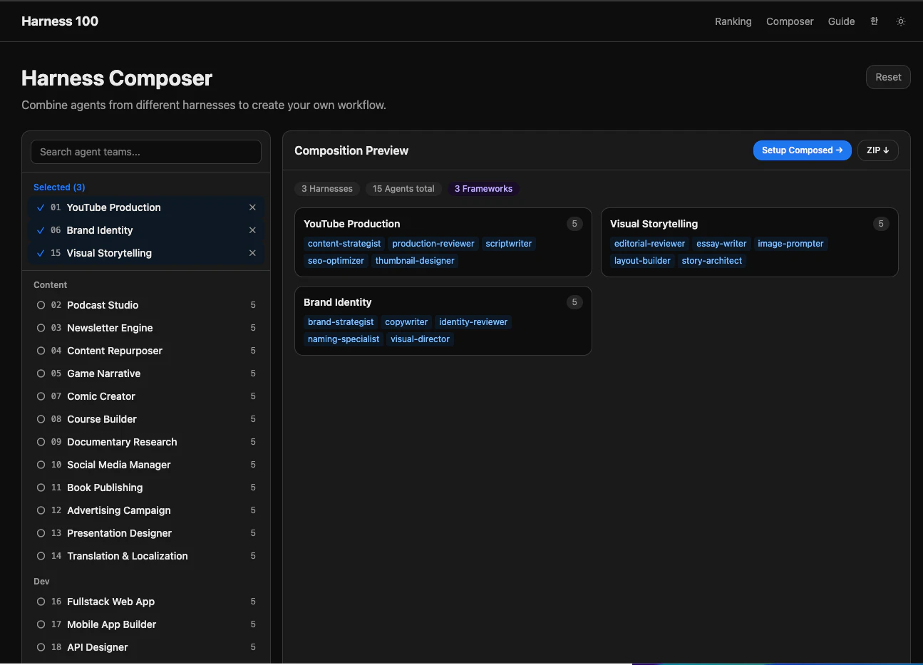 Harness 100 is an open-source catalog of 100 pre-built agent team workflows (harnesses) for Claud...