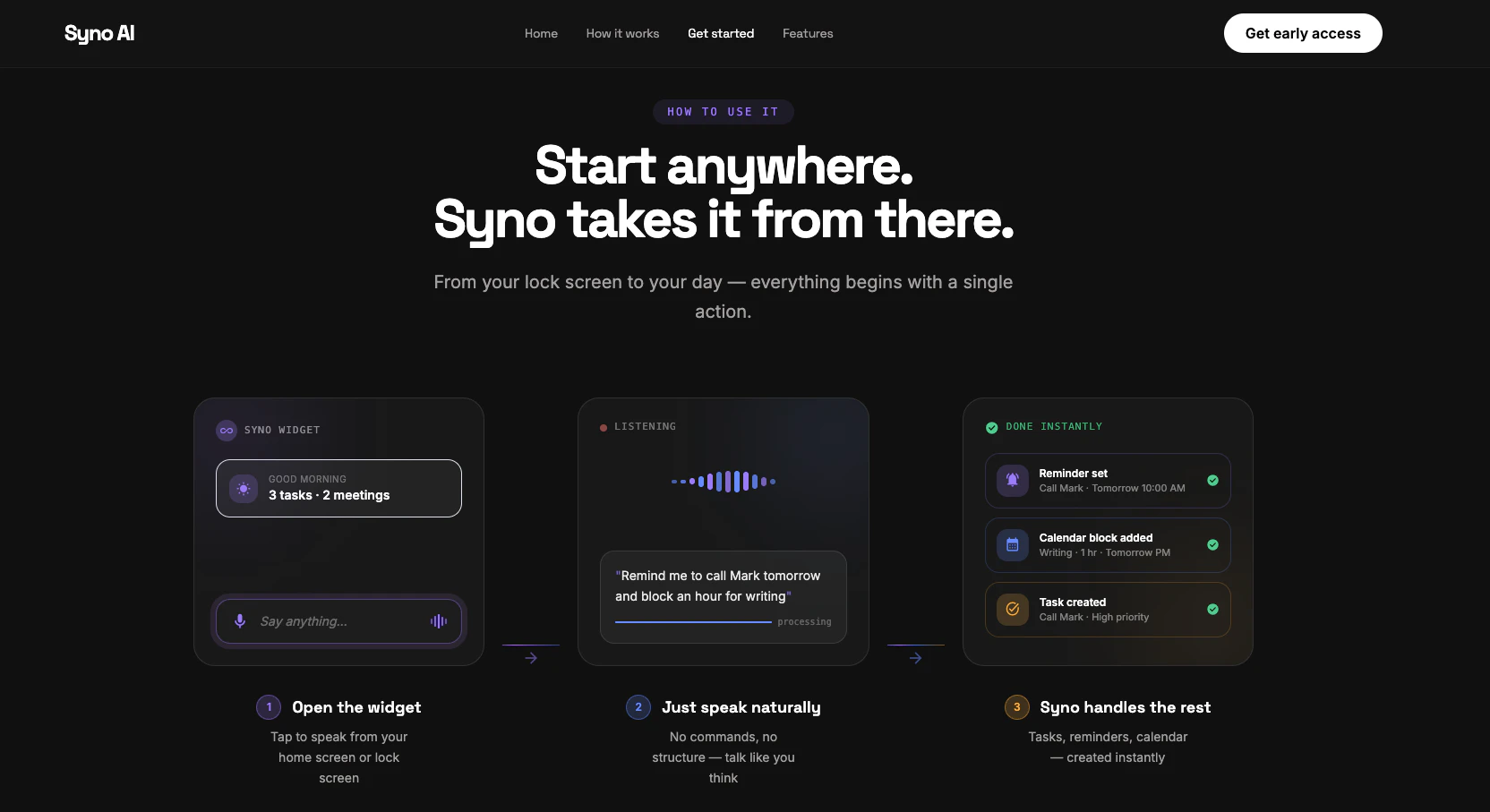 You talk, and Syno handles the rest. Capture a thought, set a reminder, log a meeting note, or ki...