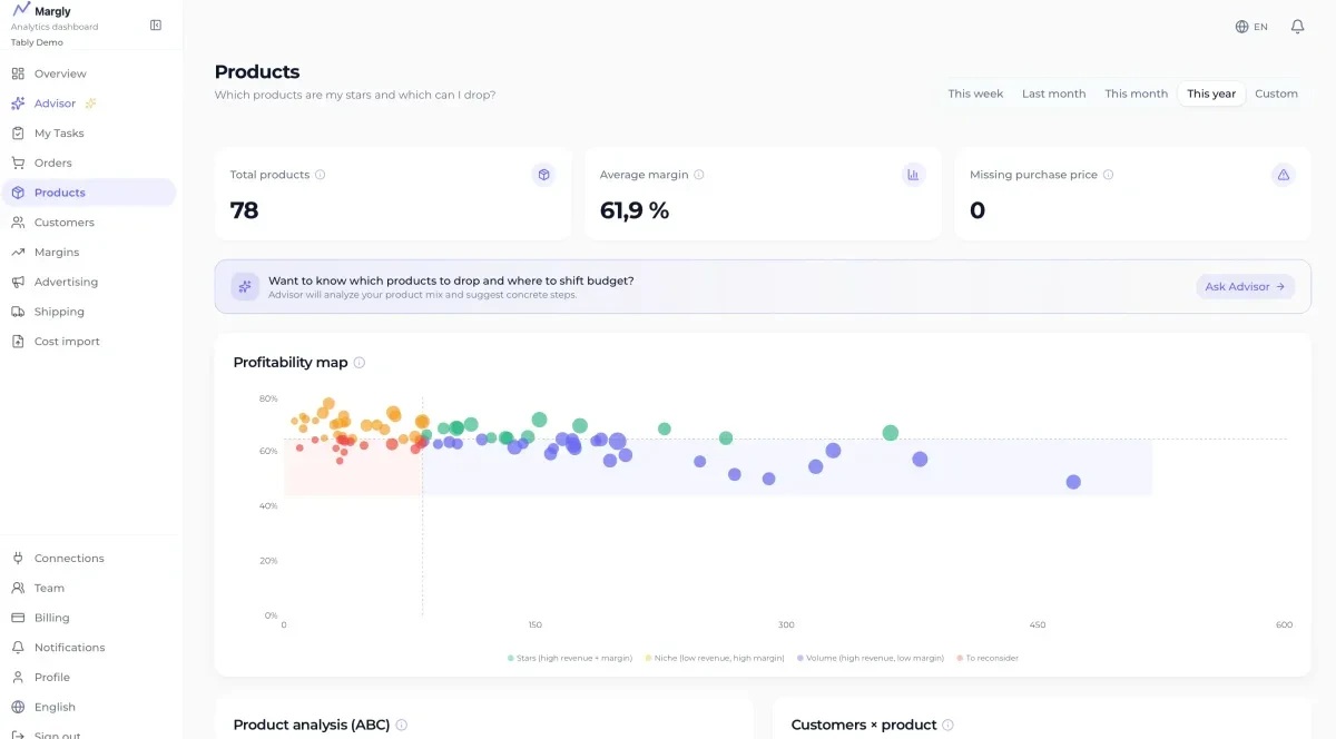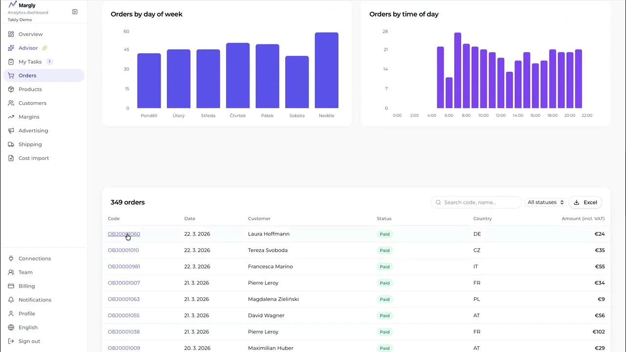 Margly connects to your e-commerce store (Shoptet, Shopify, Upgates), syncs your orders, products...