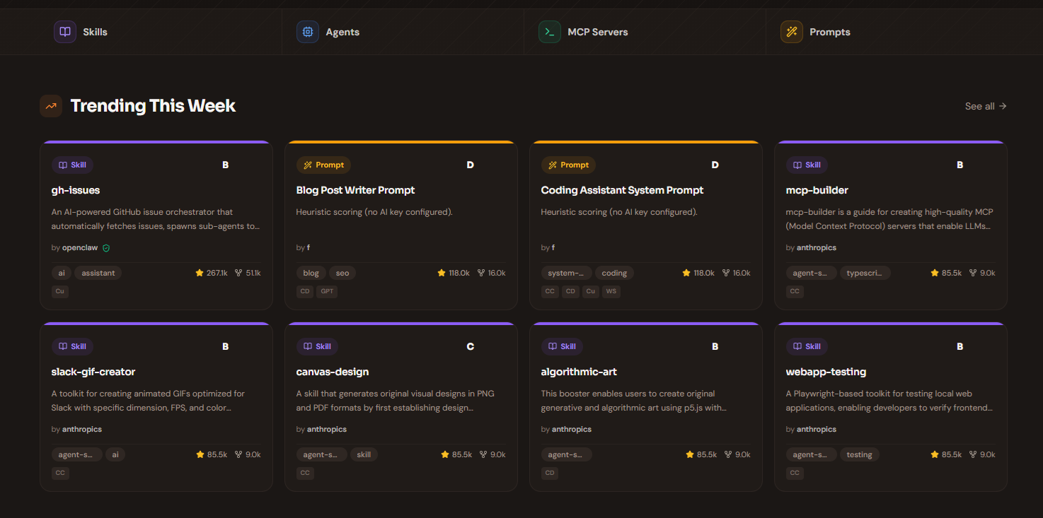 The only platform with Skills, Agents, MCP Servers & Prompts in one place. Everyone AI graded A–F...