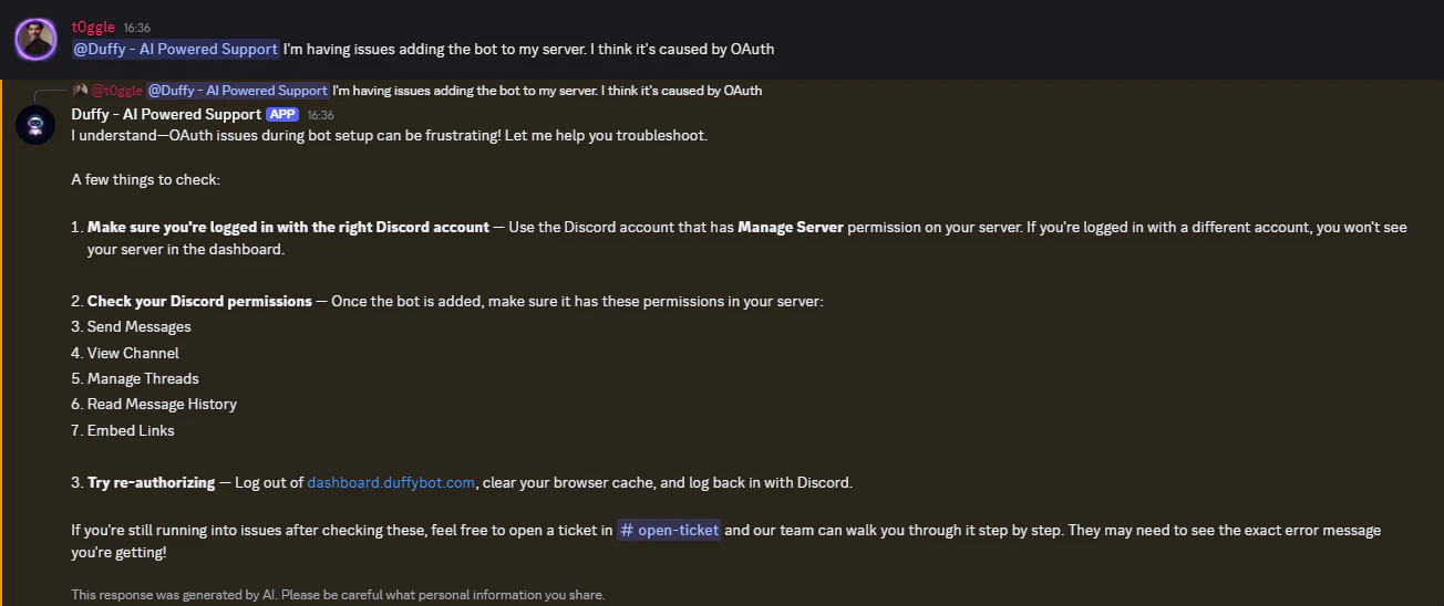 DuffyBot is an AI-powered Discord bot that answers support tickets using your knowledge base. Set...