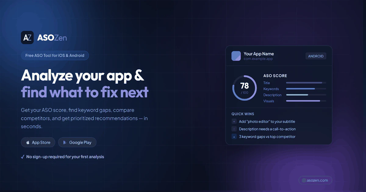 ASOZen is an AI-powered ASO platform that helps app developers turn raw app store data into clear...