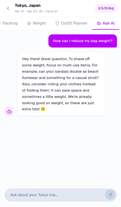 Pack light. Pack right. AI does the work.