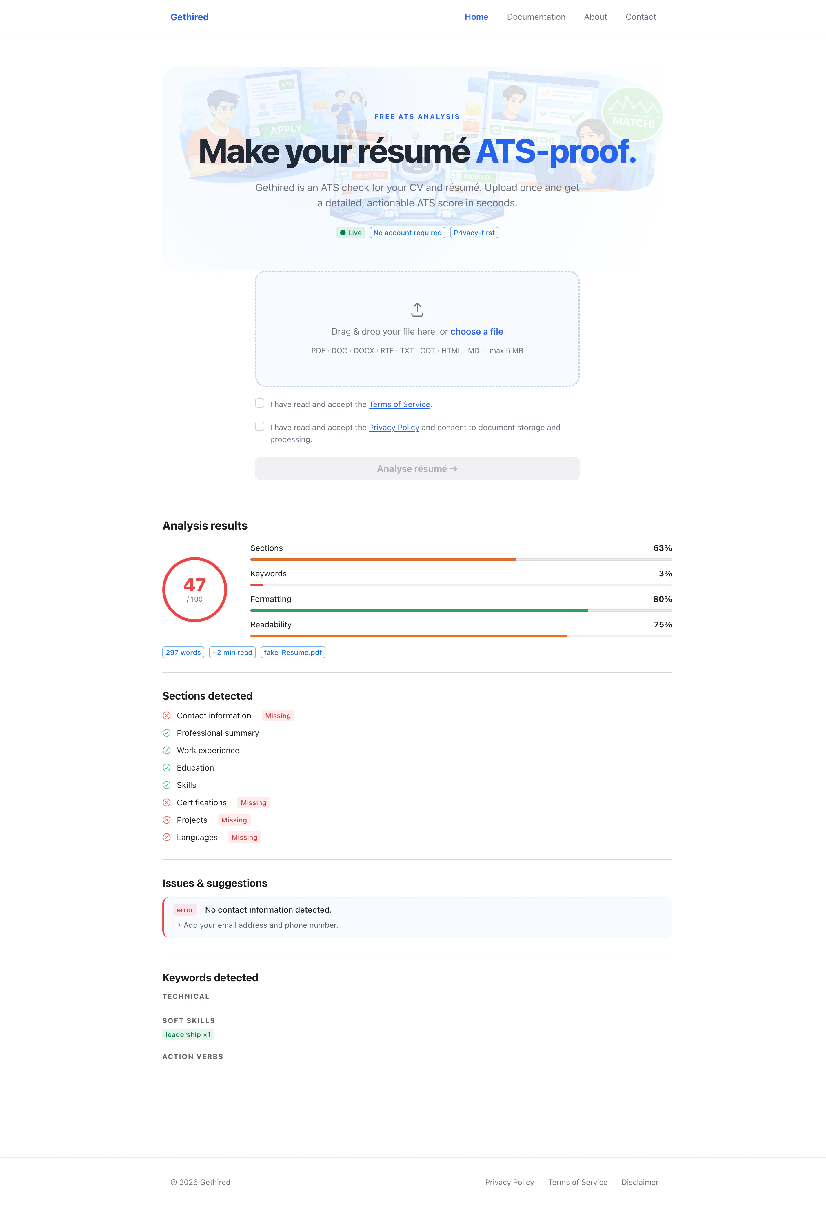 Gethired is an ATS resume checker that analyzes your CV against real applicant tracking systems. ...