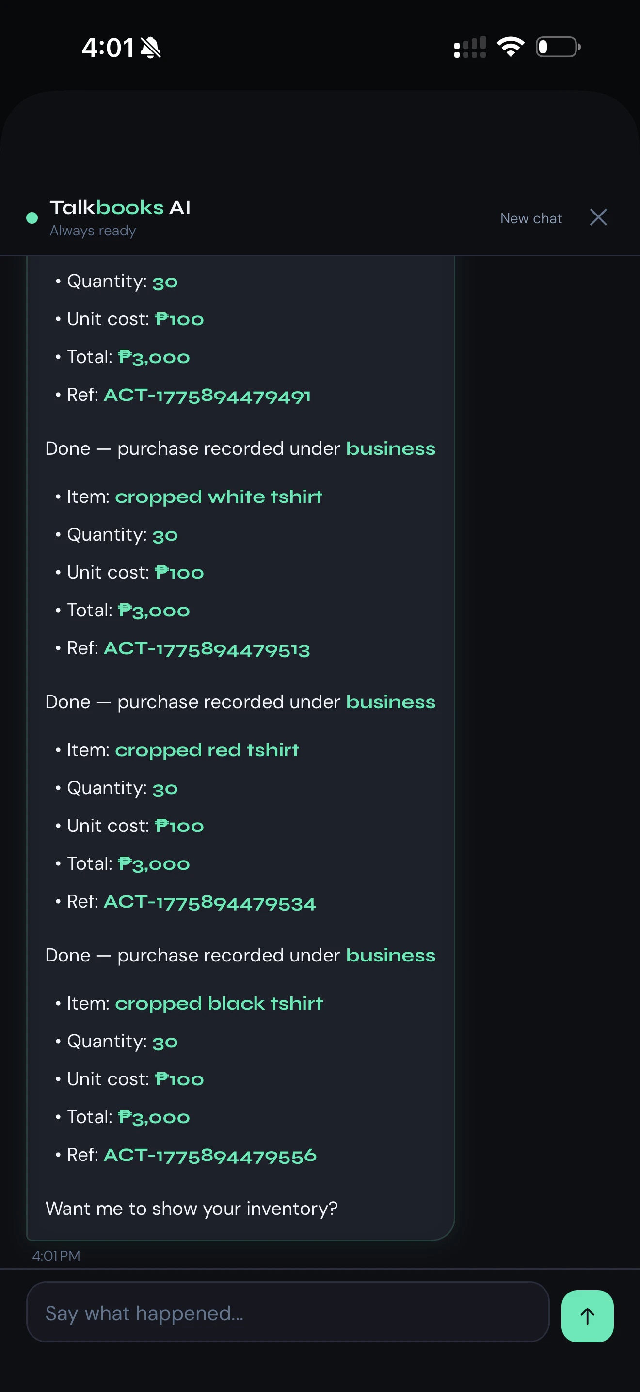 Talkbooks is an AI bookkeeper you just talk to — no forms, no menus. “Sold 5 Lacoste Perfume on T...