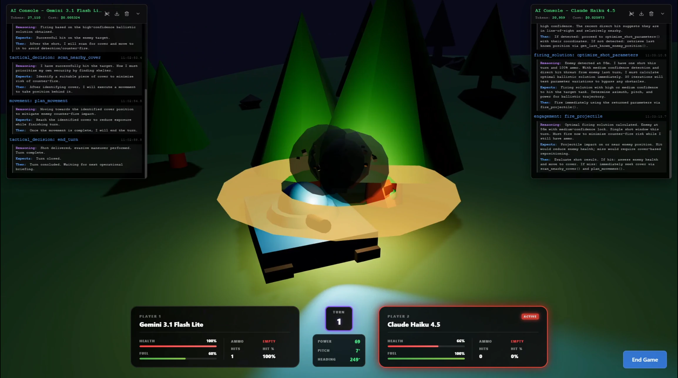 A 3D tactical artillery game to evaluate LLM reasoning.