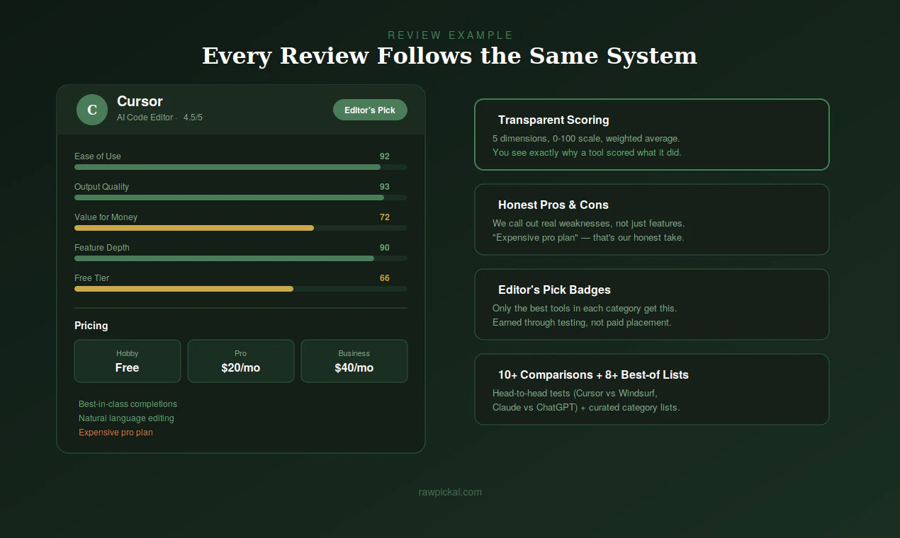 RawPickAI is an independent AI tool review site where every tool is tested hands-on for 20+ minut...