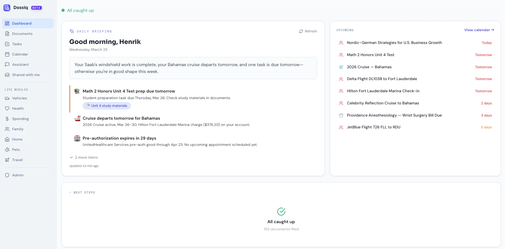Upload any household document. Dossiq reads it, classifies it, extracts every field, and shows yo...