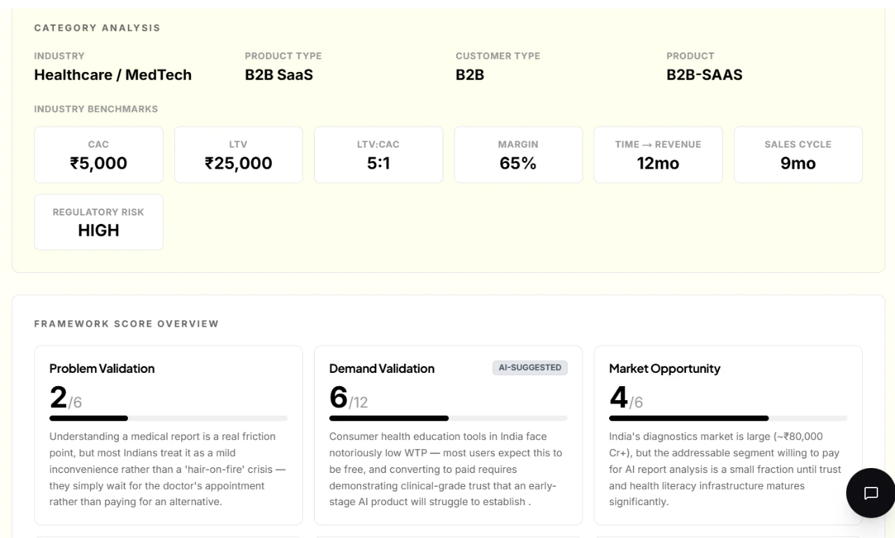 Most validators give generic AI advice. Founder Verdict scores your startup across 15 dimensions ...