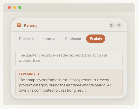 Kalamy sits in your menu bar. Select text in any app — Gmail, Slack, VS Code, Notion — and press ...
