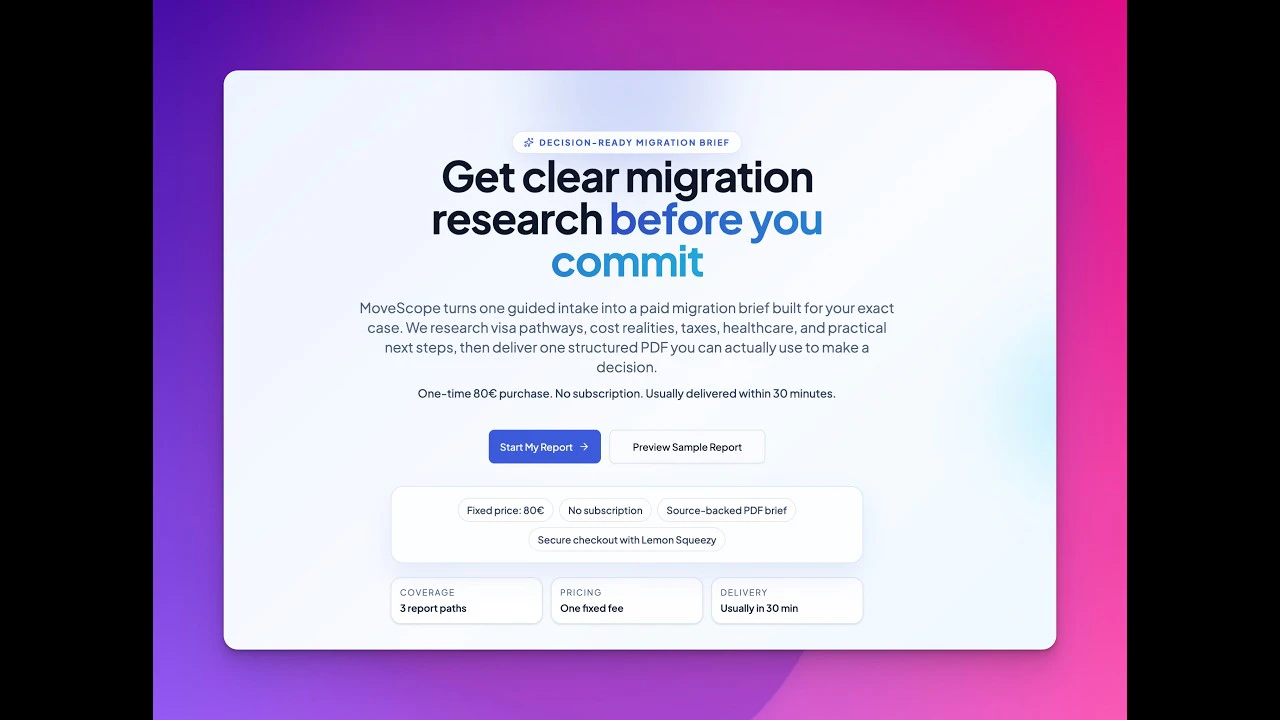 MoveScope turns messy move-abroad research into a scenario-specific relocation brief. Compare des...