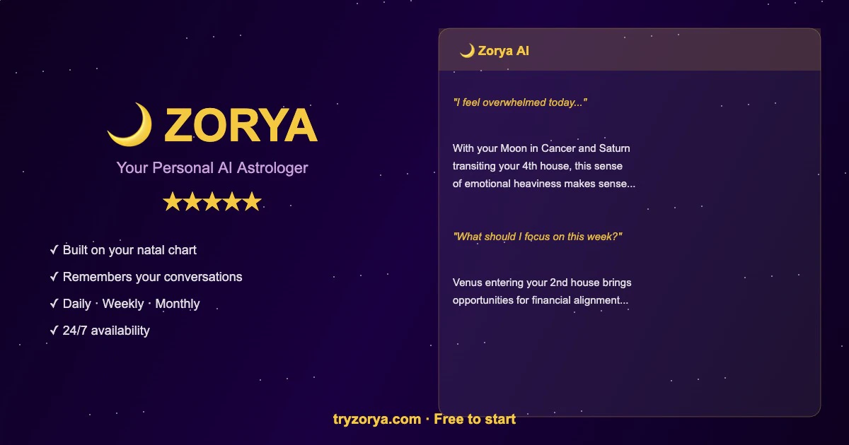TryZorya is a personal AI astrologer built around your natal chart, emotional state, and ongoing ...