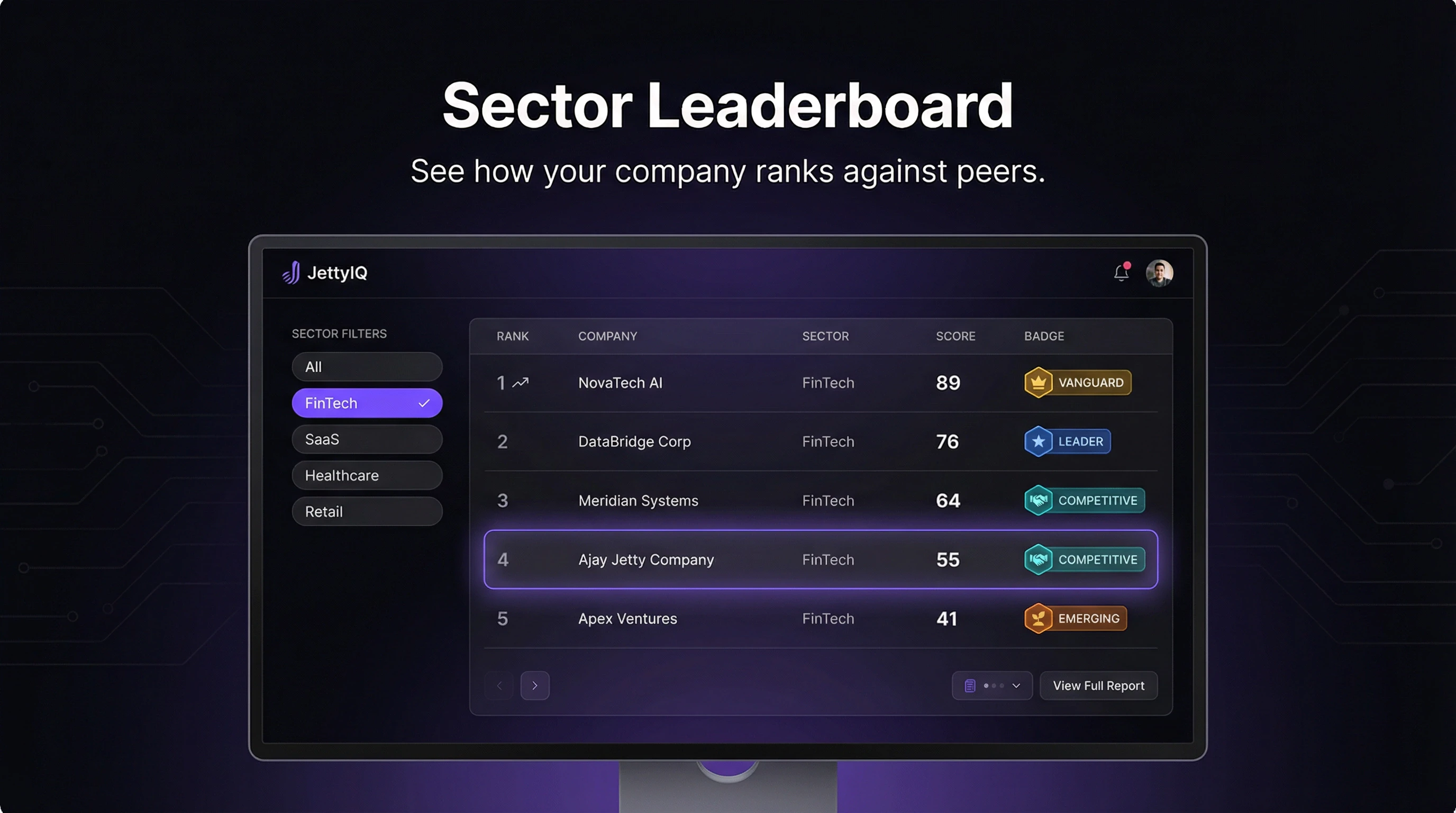 JettyIQ scores your company's AI readiness across 5 dimensions — Strategy, Data, Talent, Infrastr...