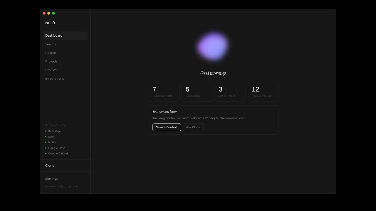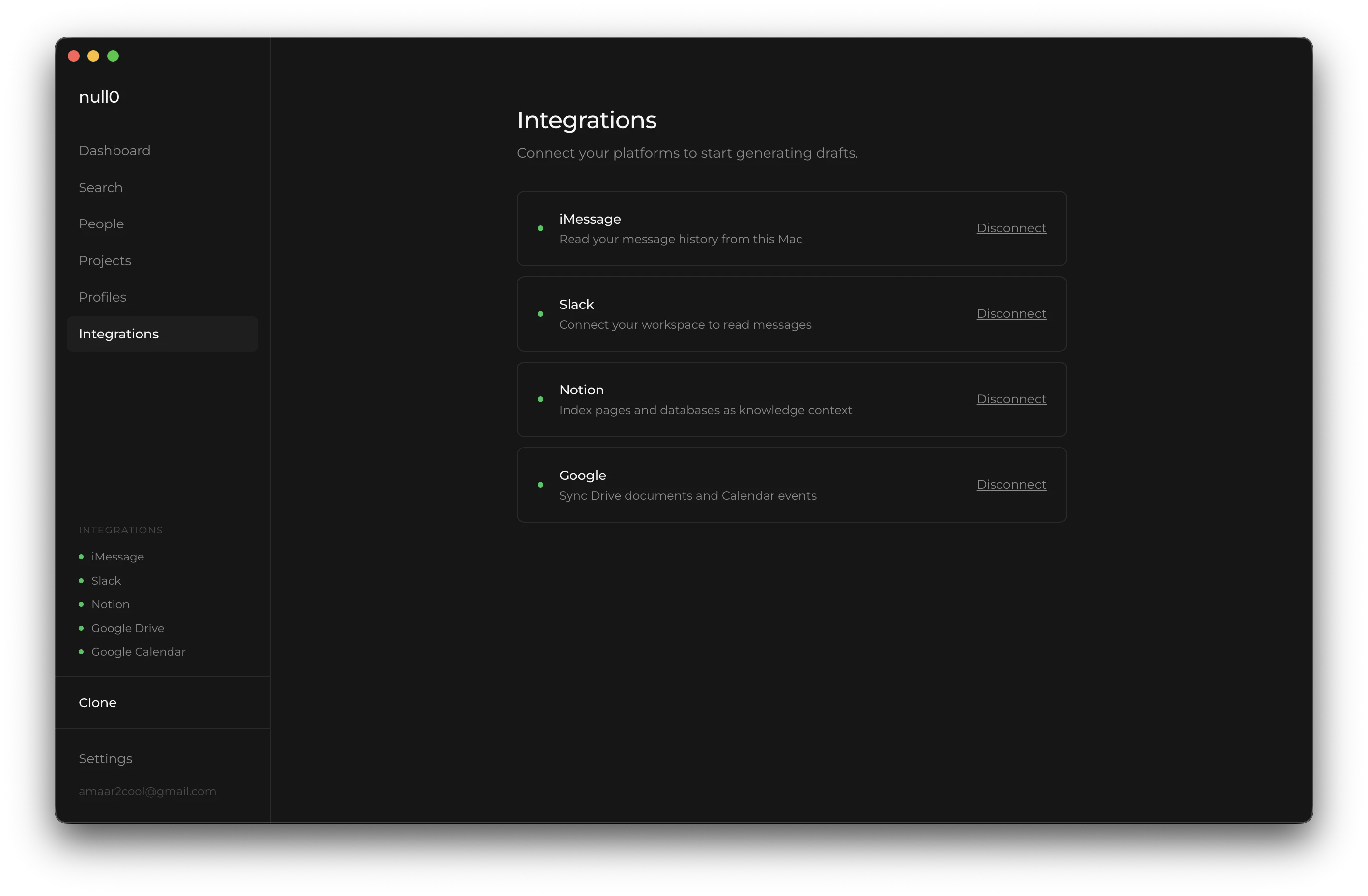 null0 connects to Slack, iMessage, Gmail, Notion, Google Drive, and Calendar, then learns who you...
