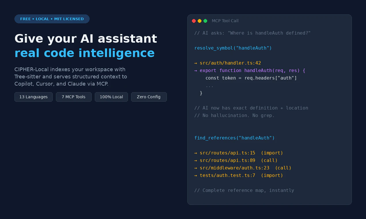 CIPHER-Local indexes your workspace using Tree-sitter and serves structured code intelligence to ...