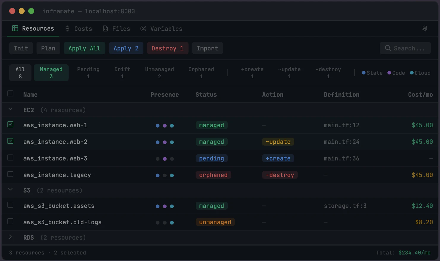 inframate cross-references your Terraform code, state, and live cloud to classify every resource ...