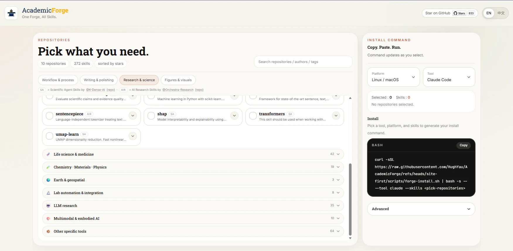 Browse academic AI skill repositories and generate install commands for Claude Code, OpenCode, or...