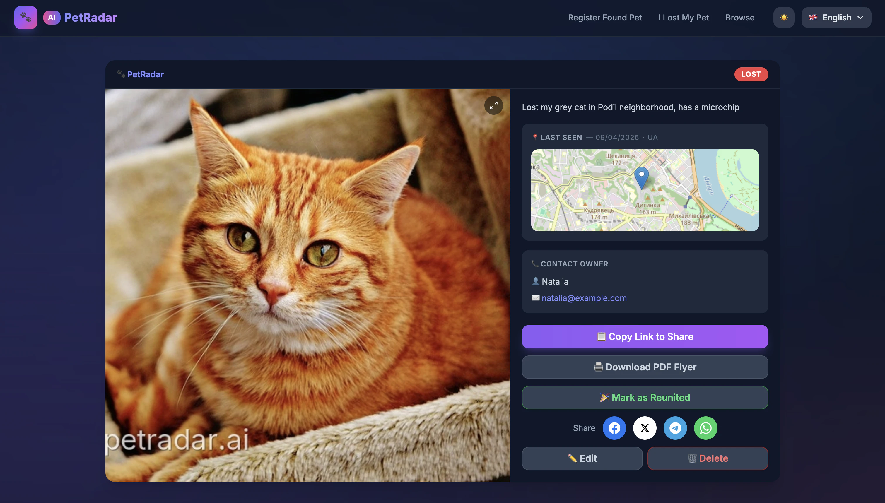 PetRadar uses AI face recognition to match lost pets with found ones. Upload a photo of a found o...