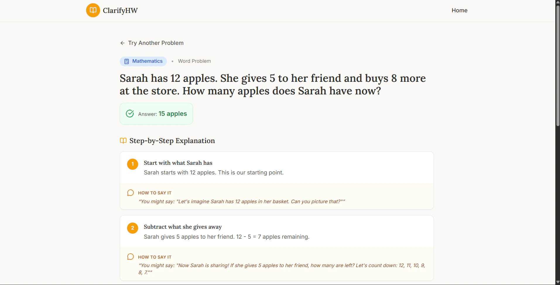 You're helping your kid with homework and you're stuck. ClarifyHW lets you snap a photo or type t...